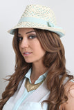Keep cool in the sun with the Bayside Beaute Fedora. Featuring woven straw throughout, ribbon strap d�cor with bow at side, pinched teardrop crown, stitching detail, and finished with full contrasting interior lining. 100% Paper.