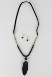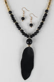 A long wood beads , and glossy metallic cube beads. Necklace features braided faux suede cord and includes matching earrings. Lead compliant.