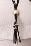 A statement necklace featuring multiple faux suede cords gathered together with an oversize brushed metallic ball and a fringed bottom with smaller brushed metallic beads. Finished with an adjustable lobster hook closure. Lead safe.