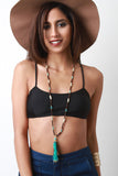 This long necklace features metallic embellishments and gems with wooden, as well as painted beads. The pendant also has wooden beads with colored string tassel accents. Finished with a lobster hook closure and matching earrings. Lead compliant.