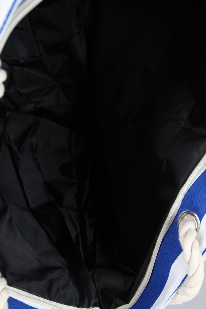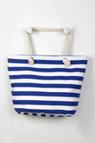 This striped pattern throughout and braided handles. Inside features full lining and an open pocket. Zipper top closure.