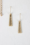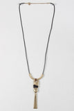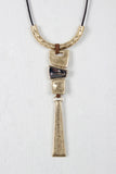This necklace features a vegan leather cord, abstract shaped mixed metal pendant, matching earrings and an adjustable lobster claw closure.