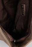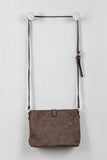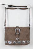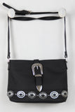 This cross body bag features a vegan leather fabrication, zipper closure, magnetic buckle strap, decorative engraved buckle details, fully lined with 1 zipper pocket and 2 pouch pockets, finished with an adjustable single shoulder strap.