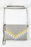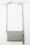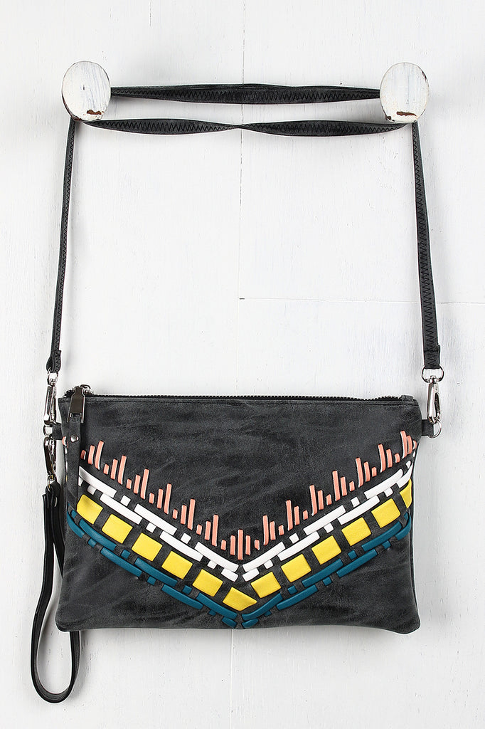 This darling crossbody clutch features a contrasting vegan leather stitching detail at front, removable crossbody strap, and top zip closure. Finished with one interior zipper pocket, detachable wristlet strap, and fabric lining. Shoulder strap has 22.5" Drop.