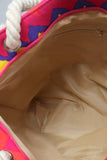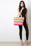 This fun tote bag features chevron print on canvas fabric and top zipper closure. Interior features single zipper pocket and full lining. Bag is finished with braided top handle (8.5" drop).