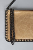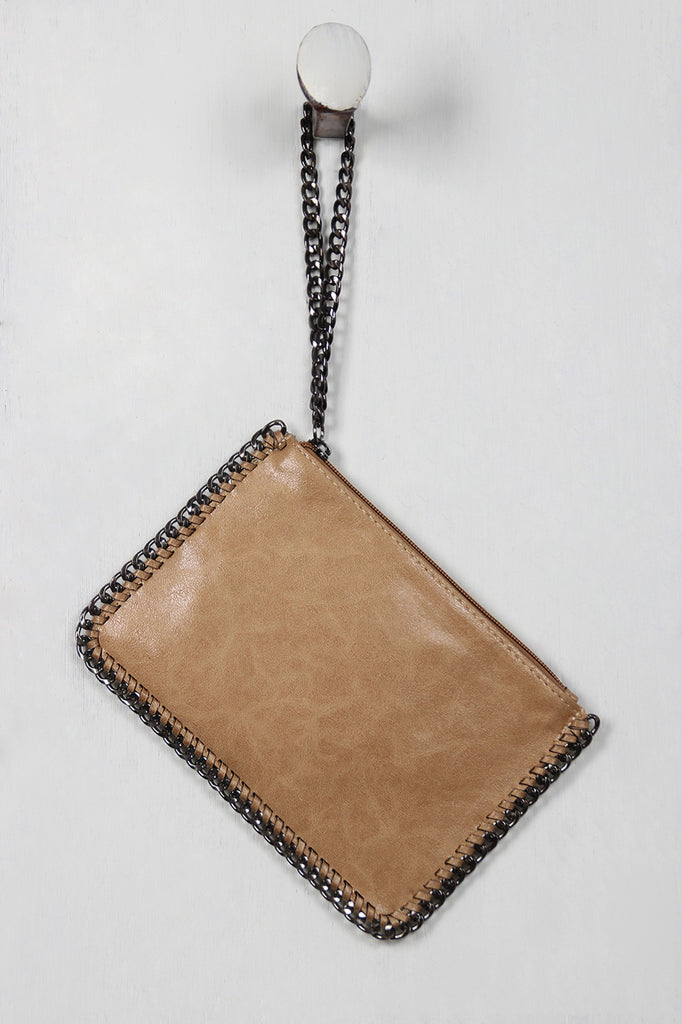 This bag features textured vegan leather, stitched edges, chain trim, and top zipper closure with wrist strap. Bag is finished with removable shoulder strap.