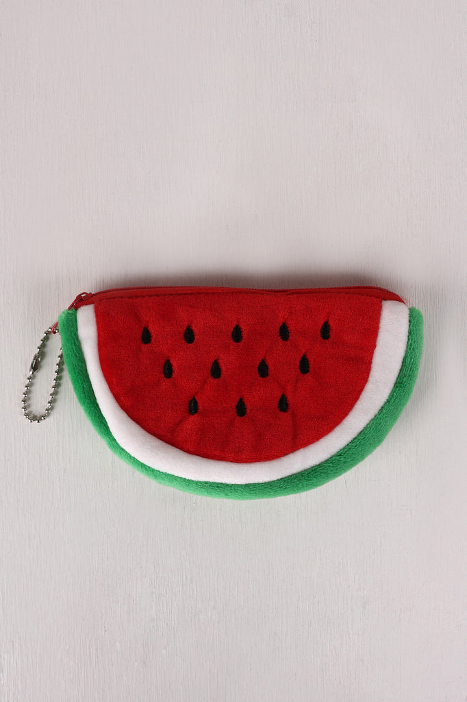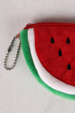This adorable coin purse features a watermelon slice shape, zipper closure, fuzzy fabrication, and a ball chain key chain.