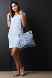 This tote bag features canvas fabrication, a tribal pattern throughout and vegan leather handles and magnetic button top closure.
