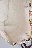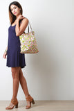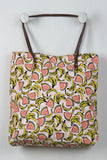 This tote bag features canvas fabrication, a watermelon and banana pattern throughout and vegan leather handles and magnetic button top closure.