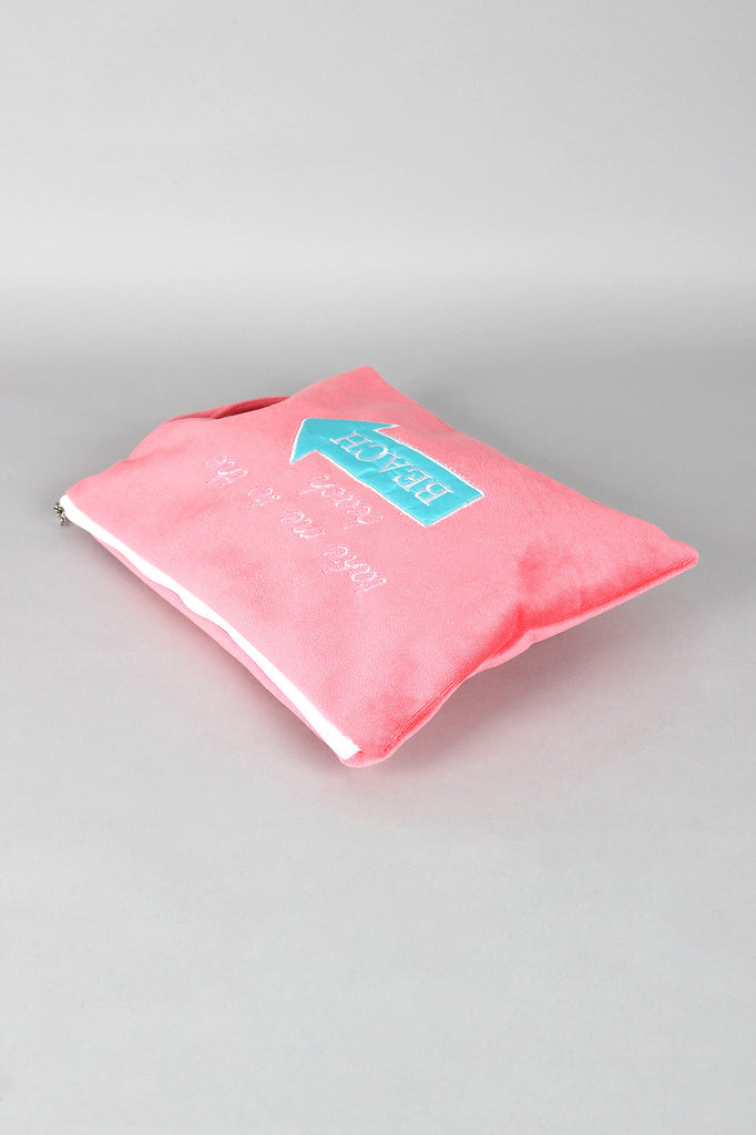 This bikini mini-bag features a soft furry material with "take me to the beach" and arrow embroidered detail at front, attached wrist strap, and anchor-detailed zipper at top. Finished with a waterproof lining.