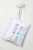 This mini-bag features a soft furry upper, attached wrist strap, embroidered "Forever Summer" with a sun and coconut trees detail, and top zipper closure with anchor. Finished with a waterproof lining.