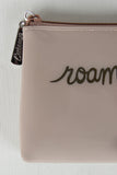This cute pouch it perfect for dog lover. It features a puppy print with the word roam, zipper closure, plastic fabrication, with a fabric lining.