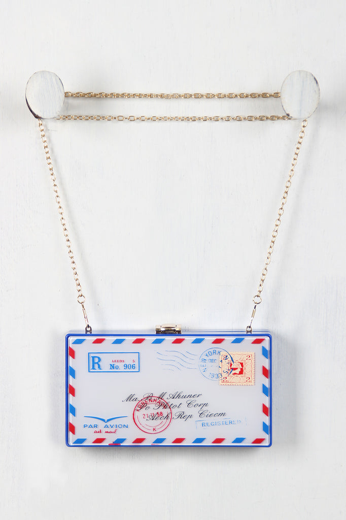 This novelty clutch features a structured rectangle design, letter printed front and back, magnetic latch closure, and a removable chain strap.