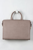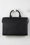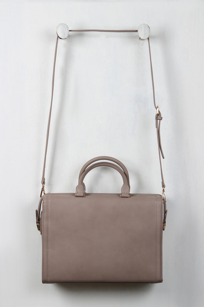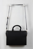 This classic bag features vegan leather fabrication, structured rectangular shape, a folded snap buckle closure, two top handles, an adjustable and removable cross body strap, lined with vegan leather, 1 inner zipper pocket and 2 open pockets. Finished with gold toned hardware and feet.