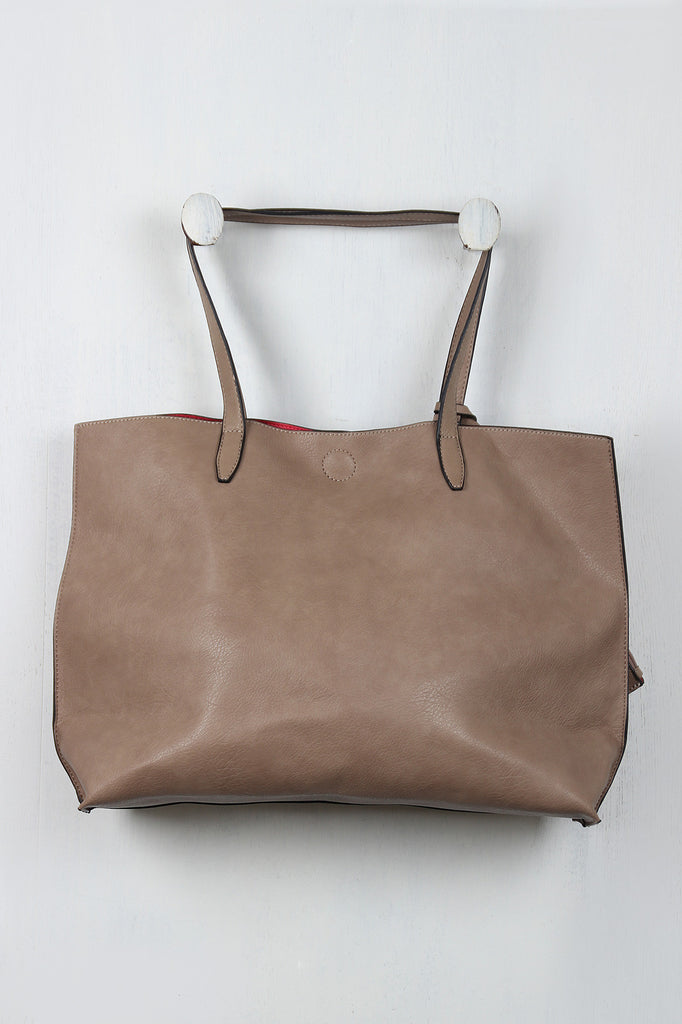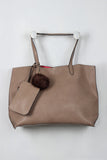 This simple tote bag features a vegan leather fabrication, no lining, single magnetic snap closure, stiff removable bottom, detachable zipper pouch, and a faux fur ball key-chain.