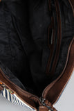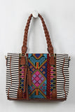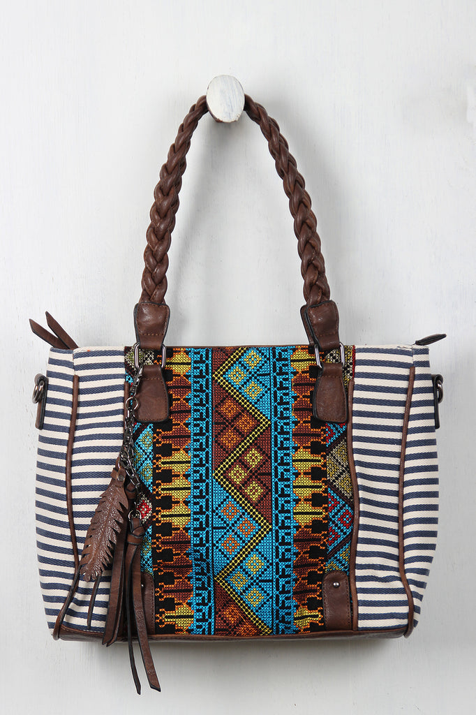 This festival ready tote bag features a embroidered panel, twill fabrication, stripe pattern, vegan leather trim, zippered top closure,fully lined, 1 inner zipper pocket and 2 open pockets, 1 outer zipper pocket, braided handles and a removable shoulder strap and a removable leather and chain charm.