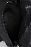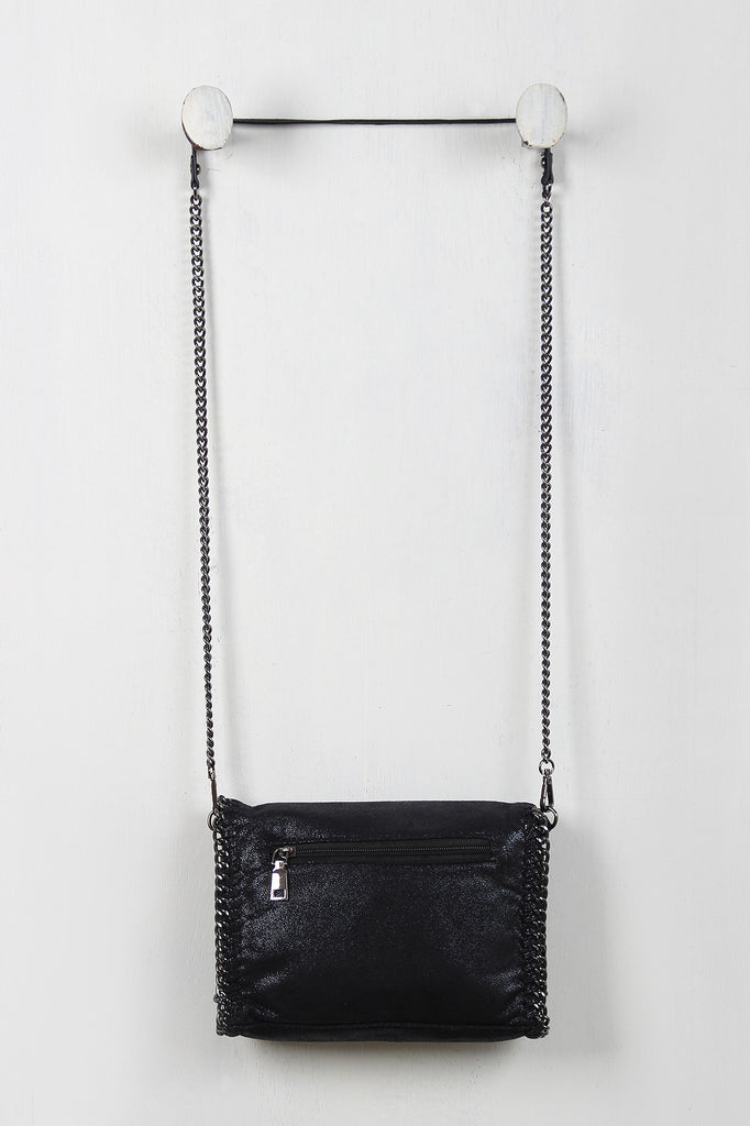 This crossbody bag features a vegan leather fabrication with a shimmer finish, stitched sides with a chain trim, fold over flap with magnetic snap closure, back zipper pocket, fully lined with a zipper pocket inside, finished with a removable chain and leather strap.
