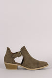These edgy ankle boots feature a smooth vegan suede upper with perforated detail, narrow toe, side cutout design with buckled strap accents, low stacked heel, and lightly padded insole for comfort.