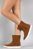These cozy ankle boots feature a round toe silhouette, vegan suede upper with back quilted design, cushioned insole, and faux shearling interior lining.