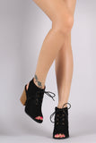 These chic booties feature a peep toe silhouette, back cutout design, lace up front, and chunky stacked heel. Finished with cushioned insole and side zipper closure for easy on/off.