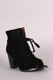 These fashionable booties feature a perforated vegan suede upper with front slit detail, wrapped around lace-up design, peep toe silhouette, and chunky stacked heel. Finished with cushioned insole for comfort.