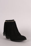 These stylish booties feature a perforated vegan suede upper with decorative chained fringe detail, round toe silhouette, and chunky heel. Finished with cushioned insole and side zipper closure for easy on/off.