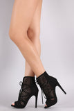 These fashionable booties feature a perforated vegan suede upper with front slit detail, wrapped around lace-up design, peep toe silhouette, and wrapped stiletto heel. Finished with a cushioned insole for comfort.