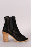 These edgy peep toe booties feature a perforated vegan suede upper with elastic gore inset, chunky stacked heel, cushioned insole, and convenient side zipper closure.