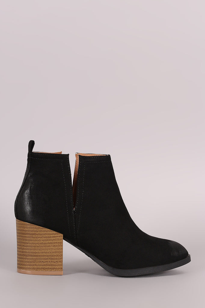 These Western inspired booties features a pointy toe with burnished accent, angle seam detail, side slits, and chunky blocked heel. Finished with a cushioned insole and pull-on construction.