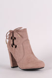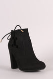 These cute ankle booties feature a rounded toe, side lace up cut out, gold tone metal aglets, wrapped chunky heel, single sole, decorative top stitching pieced details. and a side zipper for easy on/off.