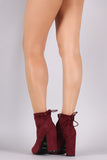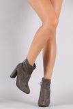 These fashion-forward booties feature a round toe silhouette, soft vegan suede shaft with adjustable drawstring closure, and chunky wrapped heel. Finished with a cushioned insole and side zipper closure.