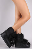 These warm and stylish boots features a vegan leather/nylon upper, decorative faux fur trims, cushioned insole, and foam insulation keeps you warm. Easy pull-on style with wraparound pom pom lace-up closure.