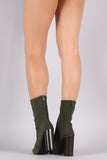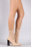 These striking boots features a pointy toe silhouette, center seam detail, and chunky heel. Finished with a cushioned insole, smooth lining, and convenient back zip closure.