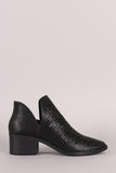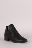 These ankle boots are almond toe silhouette. Slip on style with side slits and a mini adjustable inner side zipper. Laser cut front. Finished on a stacked chunky heel.