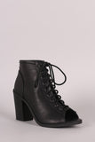 These booties feature a lace up design with a peep toe opening. Embosses perforated sides. Faux leather inside. Finished on a stacked chunky heel.