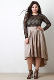This voluminous plus size skirt features crisp, shiny fabric, a wide waistband with self-tie bow back, and box pleats. Finished with side zipper closure and a high-low hemline. Accessories sold separately. 100% Polyester. Contrast: 97% Polyester, 3% Spandex.