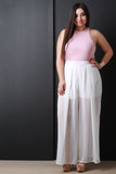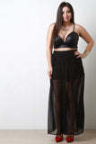 Plus size maxi pants featuring semi-sheer mesh overlay, solid shorts under layer, and a wide elastic waistband. Accessories sold separately. 100% Polyester.
