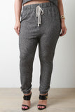 These plus size joggers feature a heathered knit fabrication, wide elasticized waist band with self-tie raw tip woven lace, and cuffed hemline. Accessories sold separately. Made in U.S.A. 60% Cotton, 40% Polyester.