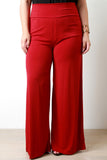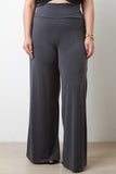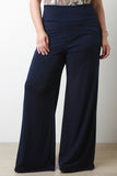 These plus size pants feature a wide leg cut, stretchy soft knit fabrication, and finished with a fold over waist band. High-waist silhouette. Accessories sold separately. Made in U.S.A. 95% Polyester, 5% Spandex.