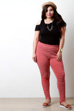 These plus size leggings feature a texturized knit fabrication with stripes print pattern throughout, elasticized waistband, high waisted fit, and taper cut finish. Accessories sold separately. Made in U.S.A. 90% Polyester, 10% Spandex.