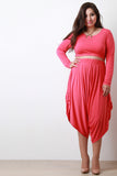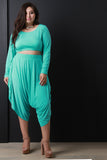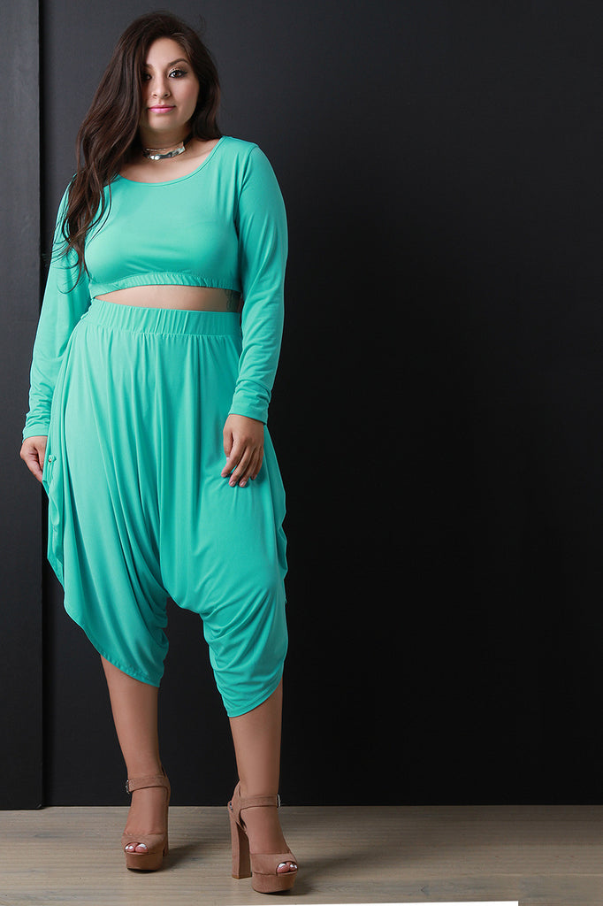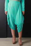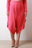 These plus size pants feature stretch fabric, elasticized waist, drop crotch, draped sides with button tab, self-tie belt, and cropped legs. Accessories sold separately. Made in USA. 95% Polyester, 5% Spandex.