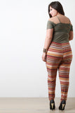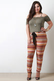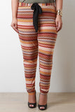 These plus size pants feature smooth stretch fabric, colorful chevron print, elasticized waist, and self-tie chiffon bow. Accessories sold separately. Made in USA. Self: 95% Polyester, 5% Spandex. Cnt: 100% Polyester.