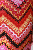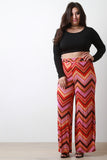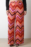 These plus size pants feature smooth stretch fabric, colorful wavy chevron pattern, and wide legs. Accessories sold separately. Made in USA. 96% Polyester, 4% Spandex.