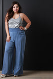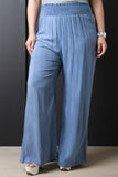 These flowy plus size pants feature a shirred elastic waistband, woven fabrication, and a wide cut leg. Accessories sold separately. 100% Rayon.