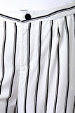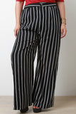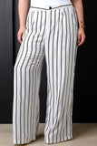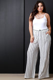 These plus size high waisted pants feature a stripe prints throughout, two front pockets, back faux pockets, and wide legs. Finished with a partial elasticized waistline and zipper fly with snap button closure. Accessories sold separately. 100% Rayon.