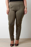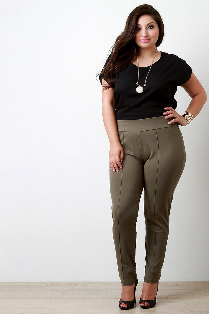 These plus size pants feature a thick stretchy knit fabrication, wide elasticized waist band, front leg seam detail, high waisted and relaxed fit. Accessories sold separately. Made in U.S.A. 65% Rayon, 30% Nylon, 5% Spandex.