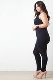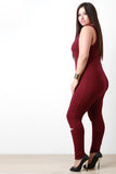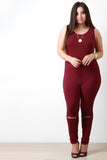 This plus size jumpsuit features a soft jersey knit fabrication, stretchy sculpture fit, round neckline, sleeveless, taper cut legs, and knee slits. Accessories sold separately. Made in U.S.A. 95% Cotton, 5% Spandex.