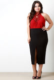 This casual plus size skirt features a stretchy knit fabric, hidden elasticized waist band, front slit detail, and midi-length hemline. Accessories sold separately. Made in U.S.A. 96% Polyester, 4% Spandex.