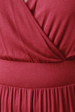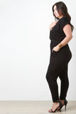 This plus size jumpsuit features a soft stretchy knit fabrication, surplice neckline, cap sleeves, cinched waistline, side slit pockets, and taper cut legs with ruched detail. Accessories sold separately. Made in USA. 97% Polyester, 3% Spandex.