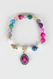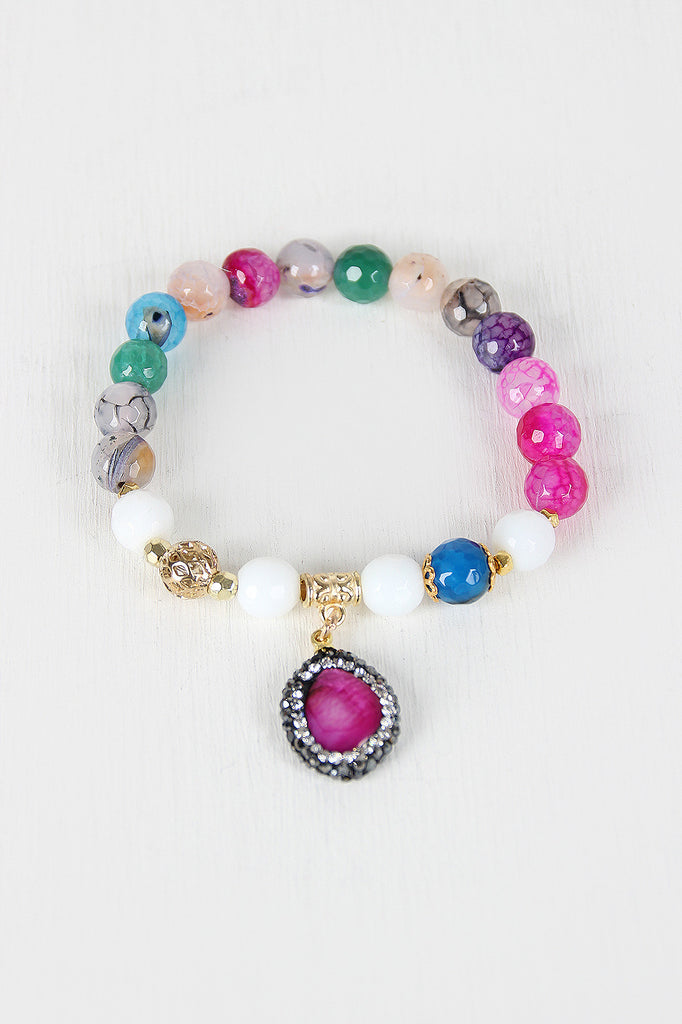 This lovely bracelet features a colorful stone beaded design with brass spacers, center gemstone with rhinestones accent charm, and easy slip-on construction.